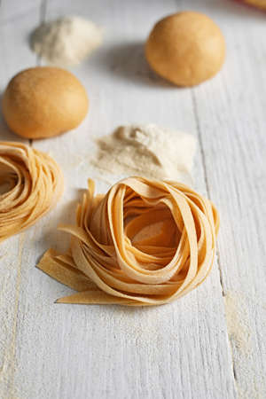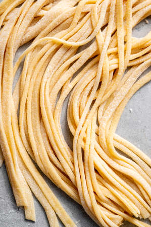 Raw homemade noodles, egg noodles. Home, healthy cooking concept.