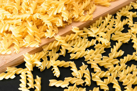 Uncooked Fusilli Pasta Scattered on Wooden Board and Black Table. Raw and Dry Macaroni. Fat and Unhealthy Food