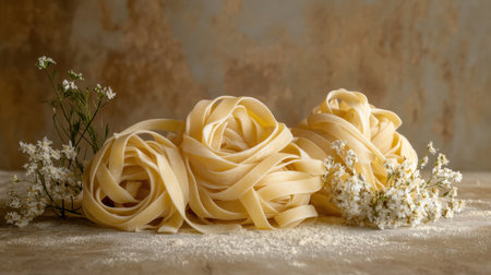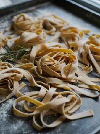 Delicate strands of homemade pasta are swirled into nests, surrounded by a sprinkle of flour and a touch of fresh rosemary, evoking warmth.