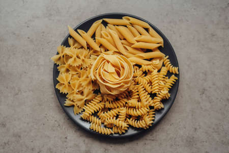 Different types of uncooked dried pasta on the black background. Raw pappardelle, penne, spaghetti, farfalle and fusilli. Italian pasta cooking concept.