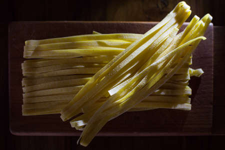 Freshly-cut home made tagliatelle pasta in the chopping board.
