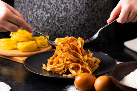 Closeup of process of making cooking homemade pasta. Chef make fresh italian traditional pasta