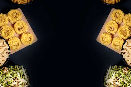 Still life of raw pasta on black plate and ingredients for its elaboration. Concept of healthy food. Vegan gluten-free food