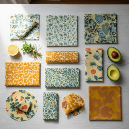 An overhead view showcases an assortment of reusable beeswax food wraps in various patterns and sizes, alongside fresh lemon and avocado halves on a wooden table.