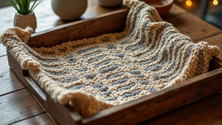 Cozy knitted blanket in wooden tray with soft texture and neutral colors. That the image is generated using AI.
