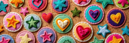 Colorful yarn embroidered patches with hearts and stars on corkboard background. That the image is generated using AI.