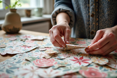 Hands crafting floral paper art in sunny workshop. That the image is generated using AI.