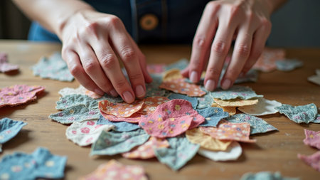 Caucasian female adult crafting with fabric scraps and felt on wooden table. That the image is generated using AI.