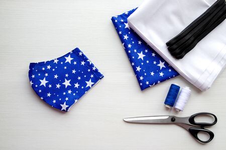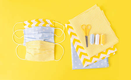 Eco-friendly reusable cloth face shield and sewing accessories on top yellow background. Homemade breathing mask making,