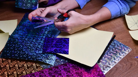 Woman hands cut craft paper with scissors. DIY craft project making with glittering craft papers and scissors. Creating handmade gifts for Christmas or kids birthday