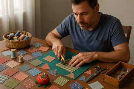 Tailor carefully cutting fabric squares and triangles on cutting mat, preparing them for sewing patchwork quilt