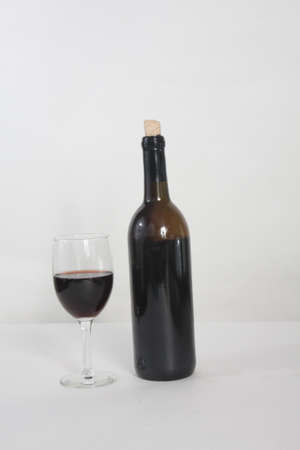 Bottle and glass of red wine against a light colored background.