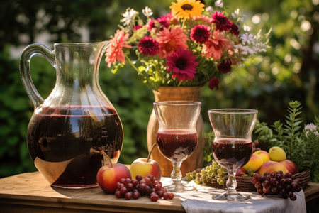 garden setup with wine glasses, sangria pitcher and floral decorations, created with generative ai