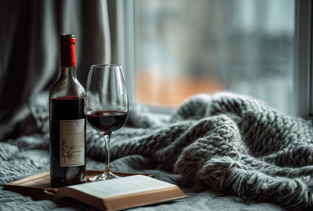 A glass of red wine on table in the room with sunset light on curtian background.