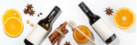 Different mulled wine ingredients set on white background, flat lay with wine bottle, cinnamon, apple, orange, anise star, simple autumn food drink cooking background