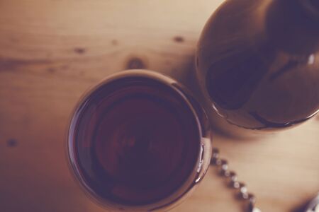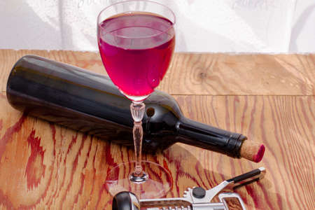 a glass of dry red wine a bottle and a corkscrew on the kitchen table. High quality photo