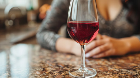 Glass of red wine in hand at a special event, a specific tasting of alcoholic beverages.