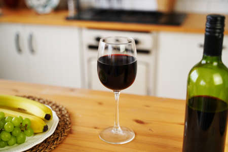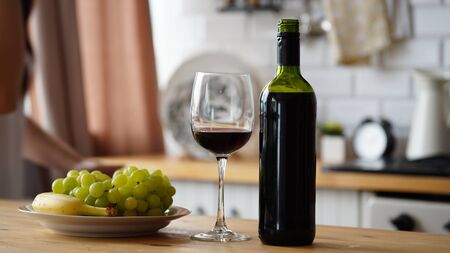 Close up of kitchen table with bottle, glass of red wine and fruits on plate. Body part of unrecognizable woman near table in kitchen