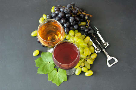 glasses of red and white wine and grapes in field background