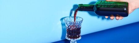 Pouring of tasty wine into against color background