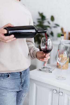cropped view of man pouring red wine in glass in modern kitchen