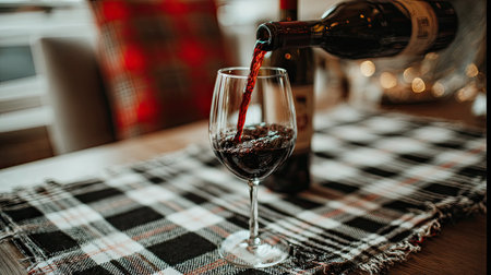 Red wine pours from a bottle into a glass AI