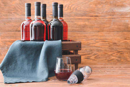 Glass bottle of red wine on a wooden table in a dark room