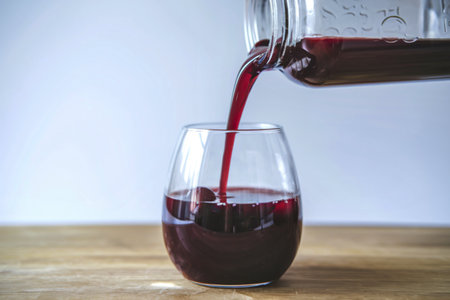 A photograph of a glass filled with vibrant, deep red cherry juice