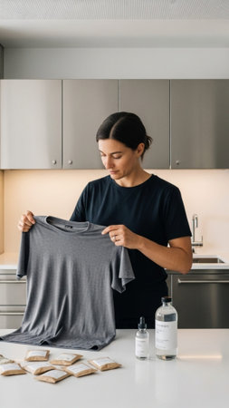 A vertical, full-body photograph of an adult standing in a modern utility room, examining a faded te