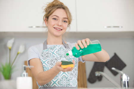 A woman cleaning lady or houswife washing dishes in kitchen. Woman Wearing a uniform apron and latex gloves. cleaning agency provides its services