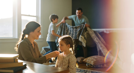 A family building a fort together in a cozy living room with a woman and child in the foreground