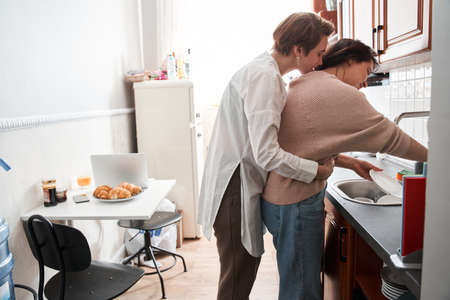 Adult couple in casual clothes, wiping with sponge in modern kitchen