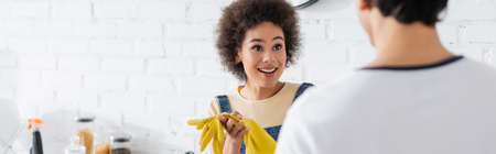 curly african american woman with rubber gloves looking at blurred man at home, banner