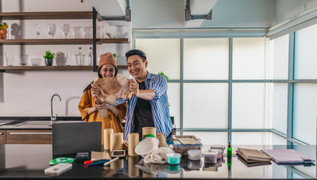 A mother, son, and daughter from a family business host a live stream, showcasing ceramic products on camera while managing orders and engagement for e commerce sales.
