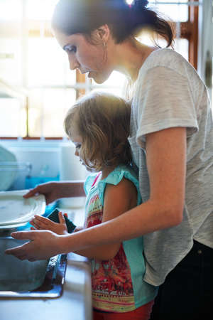 Helping to get the dishes clean. Shot of a mother and daughter washing dishes together.