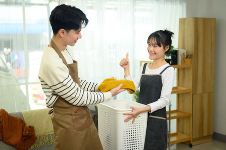 Happy attractive Asian young couple throw clean colorful bath towel fabric after washing on laundry machine. Cheerful wife and husband on housework duty in weekend.