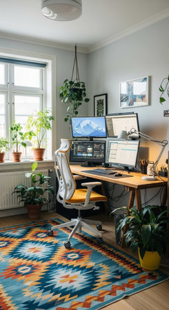 A well-lit home office featuring dual monitors, a wooden desk, a yellow chair, and numerous potted plants on a colorful rug.