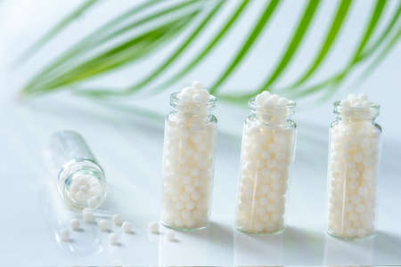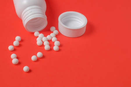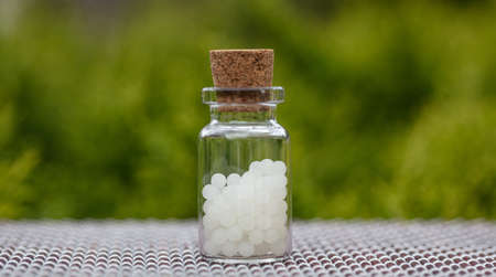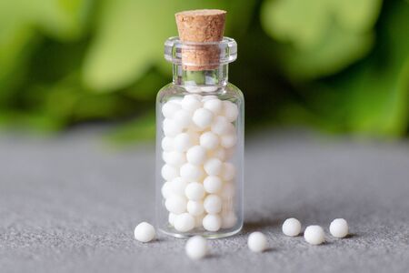 Classical homeopathy pills, white globules in a glass bottle close up, alternative medicine concept.