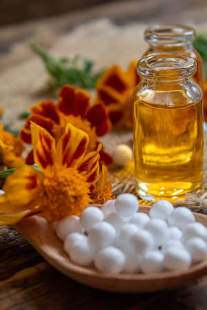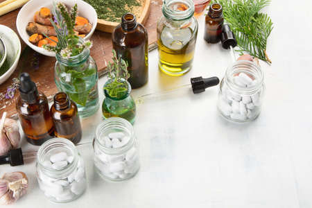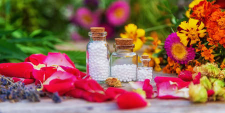 Bottles of homeopathic globules and medicinal herbs. Homeopathy medicine concept.