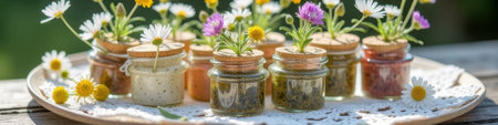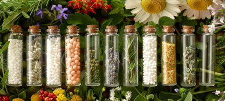 Variety of homeopathic remedies in small glass vials, neatly arranged against a background of fresh herbs and flowers. Concept of homeopathy, alternative medicine, holistic health, natural ingredients