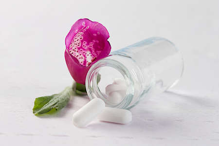Homeopathic pills in plastic container, in front of Officinalis fresh plant extract