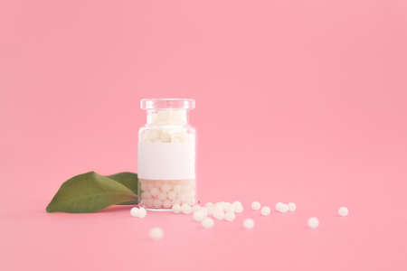 Close-up image of homeopathic globules in glass bottle on pastel pink background. Homeopathy pharmacy, herbal, natural medicine, alternative homeopathy medicine, healthcare. Free space, copy space.