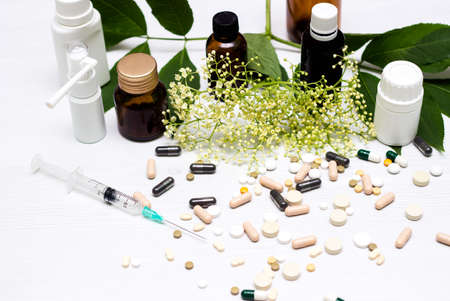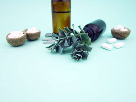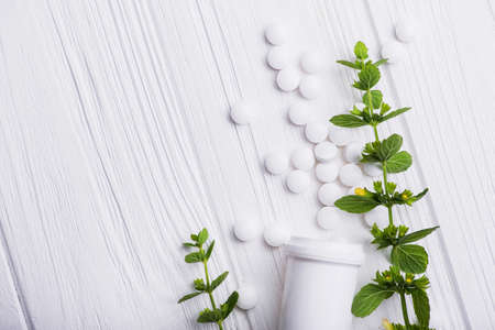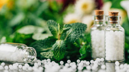 Homeopathy Close Up. Homeopathic pills in bottles, background decorated with fresh green herbs and flowers.