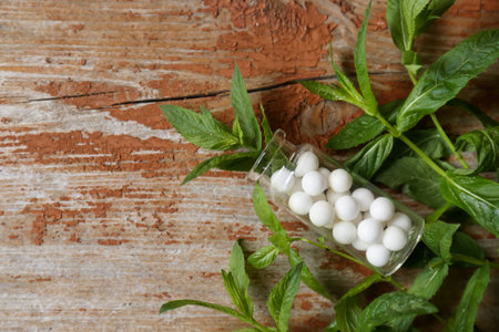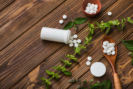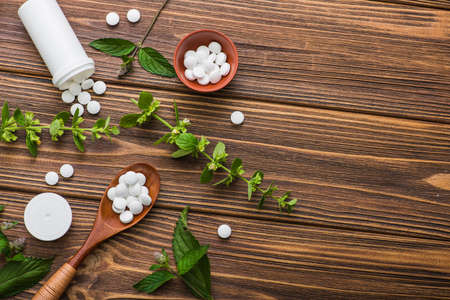 Bottle of homeopathic remedy and mint on wooden background, flat lay. Space for text