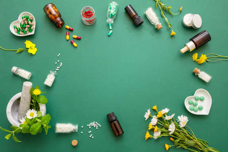 Alternative herbal medicine. Homeopathic globules, fresh wild flowers and herbs flat lay on green background. Aromatherapy, Homeopathy natural products