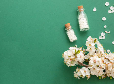 Homeopathy, almond fresh blooming twig and globules pills on green background, top view, copy space