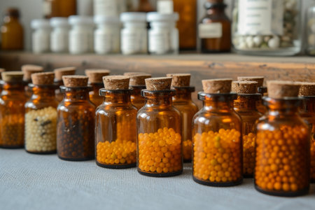 A row of glass bottles arranged in a neat line, each one filled with a mixture of yellow and black beads, Bottles of homeopathic remedies lined up, AI Generated