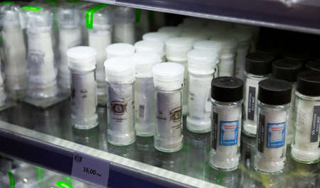 Homeo Homeopathy in small jars. Herbal extract. Selective focus.