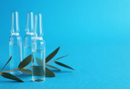 Medical ampoules with solution and eucalyptus branch on light blue background. Space for text