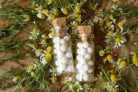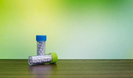 Homeopathic medicine bottles containing homeopathic pills on wood surface with green background